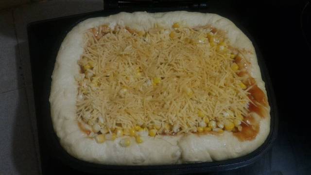 mengolah pizza jagung keju menjadi hidanga makan siang mu.